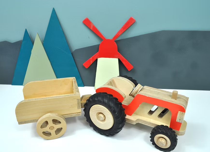 Fergus le tracteur, un joli tracteur en bois, avec sa remorque basculante que l’on peut atteler et dételer, plongera votre enfant dans l’univers de la ferme et de l’agriculture.